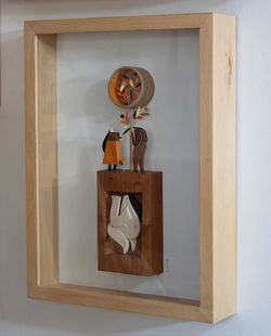 Esta obra esta realizada con materiales que provienen de la madera, cartón, papel, corcho, madera y pintura acrílica.